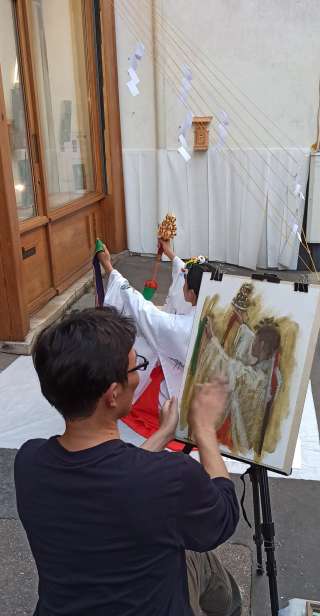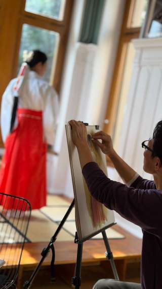 カフェの一室を使い、舞殿を作り、イーゼルを立てて描く。
